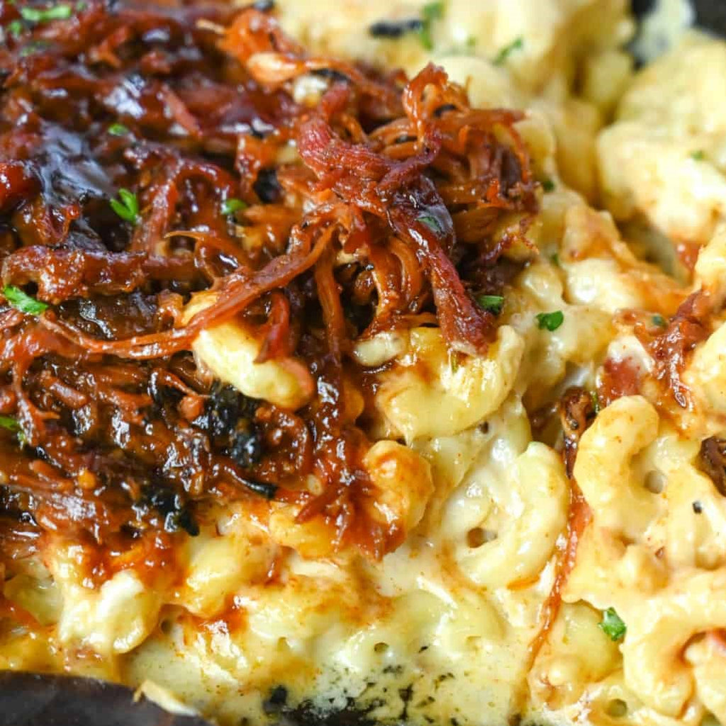 BBQ Pork Mac n' Cheese: McMahon's Smoked Pulled Pork tossed with Central Illinois' Squatters Knob BBQ Sauce, topped with homemade Mac n' Cheese made with colby jack and pepperjack cheeses!