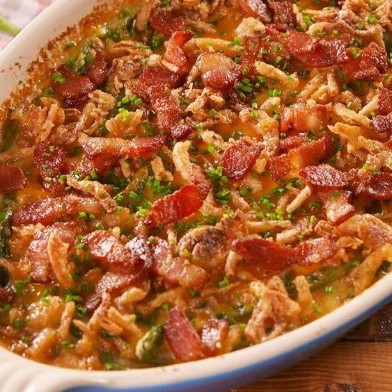 Loaded Green Bean Casserole. Fresh green beans covered with a homemade cheese sauce then topped with crispy fried onions, bacon, green onion and more cheese.