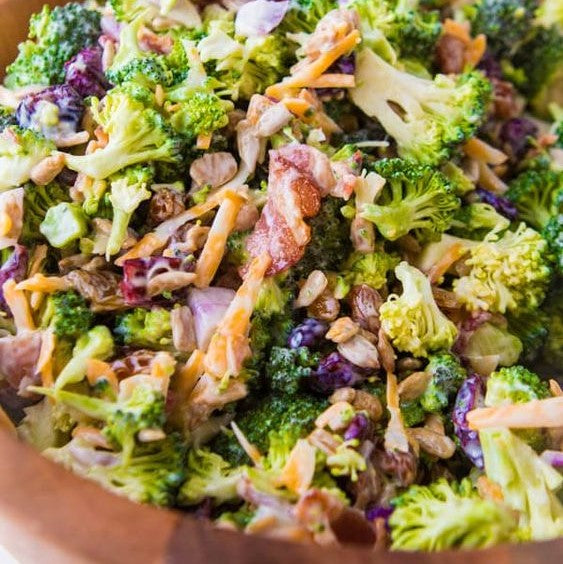 Broccoli Salad. Fresh chopped broccoli, bacon(need I continue?!), cheddar, red onion, cranberries and sunflower seeds tossed in a sweet homemade dressing! (4 Cups Salad, 10 Cups Salad)